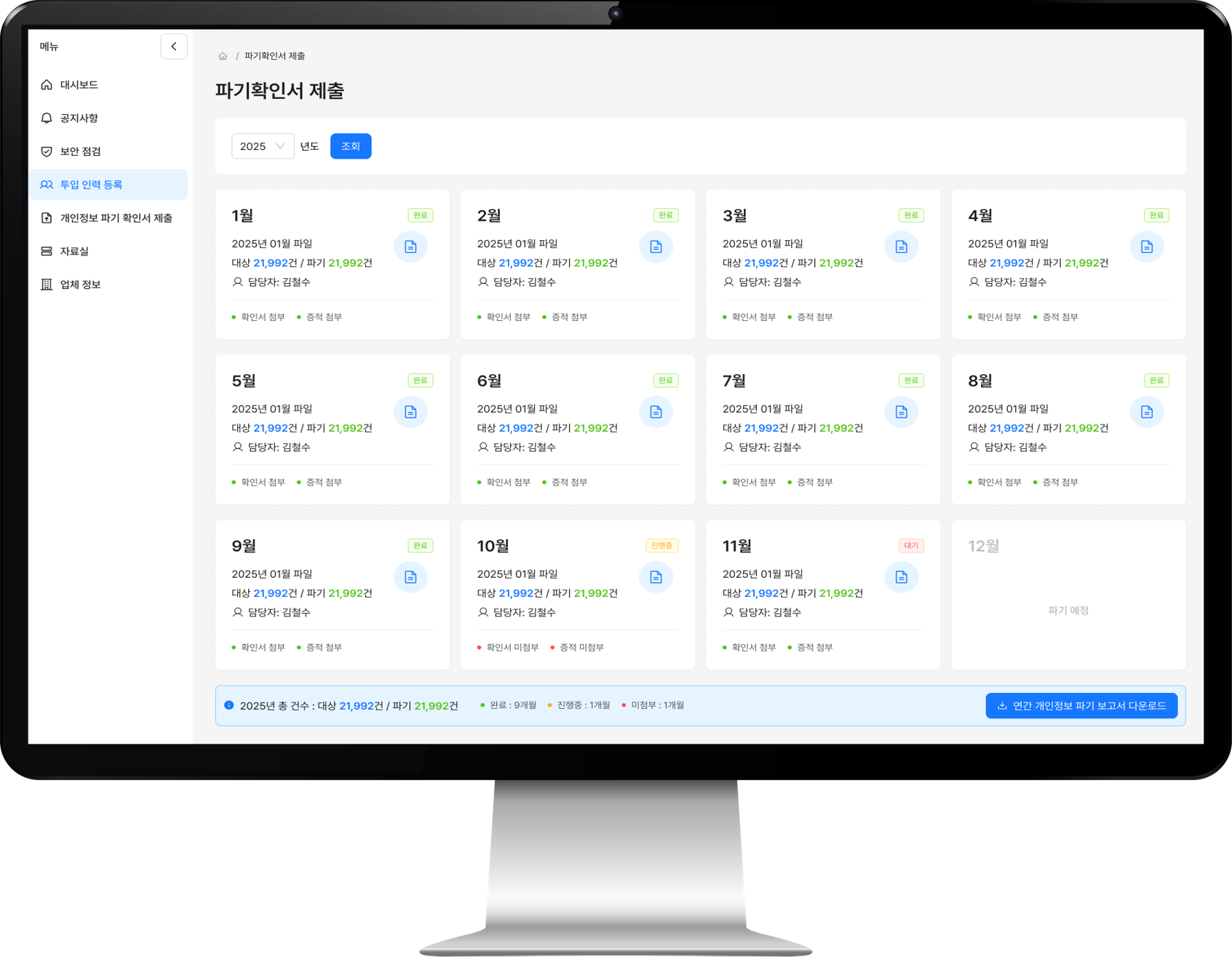 파기확인서 전자 업로드, 점검 현황·미완료 건 알림, 제출 현황 한눈에
